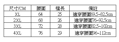 尺碼:XL(適穿腰圍69.5~82.5cm)/2XL(適穿腰圍76~92.5cm)/3XL(適穿腰圍82.5~102cm)/4XL(適穿腰圍96~112cm)